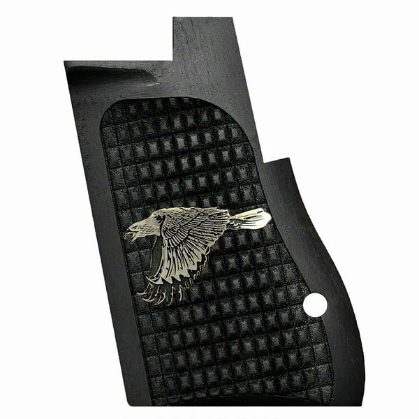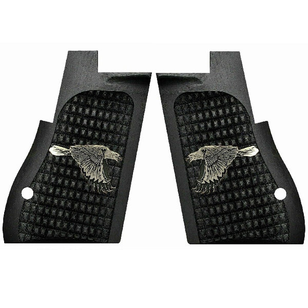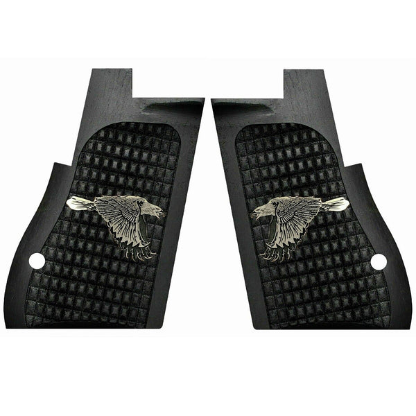 Desert Eagle Custom Pistol Grips made of Walnut wood (painted Black) with Custom logo made of silver,crafted to deliver striking aesthetics and lasting performance. These grips are precision-milled for a perfect fit and hand-polished to a smooth finish.