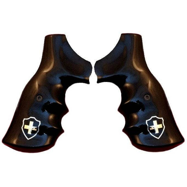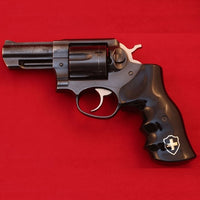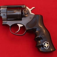 Ruger GP100 grips made of Black Acrylic with custom logo made of Silver.