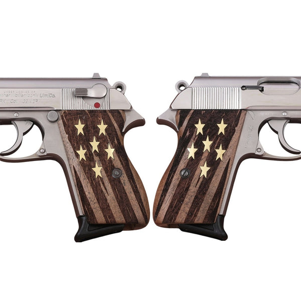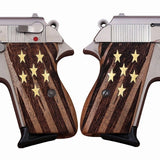 Walther PPK grips (does not fit Arkansas). Made of Walnut Wood with custom logo made of Brass.