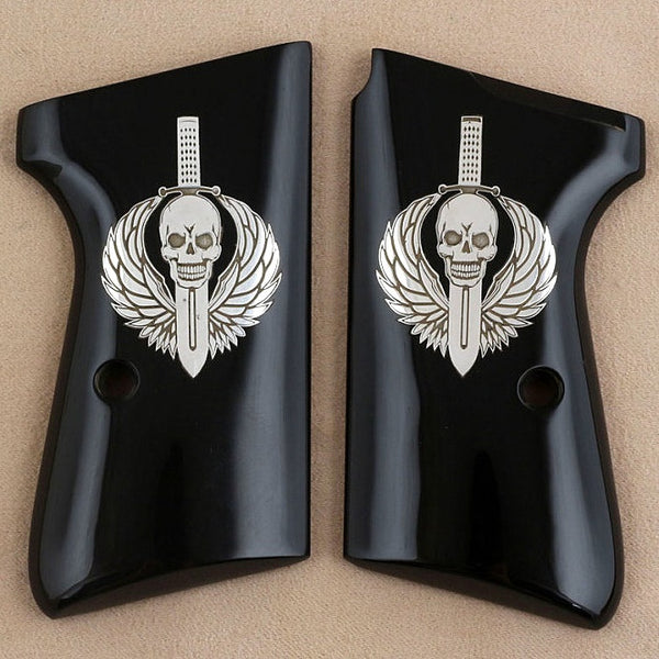 Walther PP grips (does not fit Arkansas). Made of Black Acrylic with custom logo made of silver.