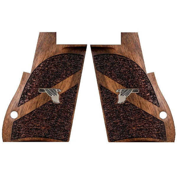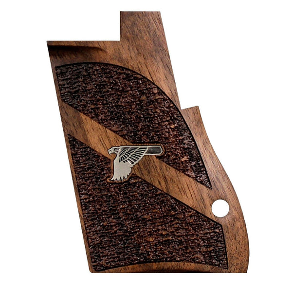 Desert Eagle Custom Pistol Grips made of Walnut wood with Custom logo made of Silver,crafted to deliver striking aesthetics and lasting performance. These grips are precision-milled for a perfect fit and hand-polished to a smooth finish.