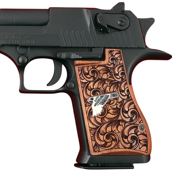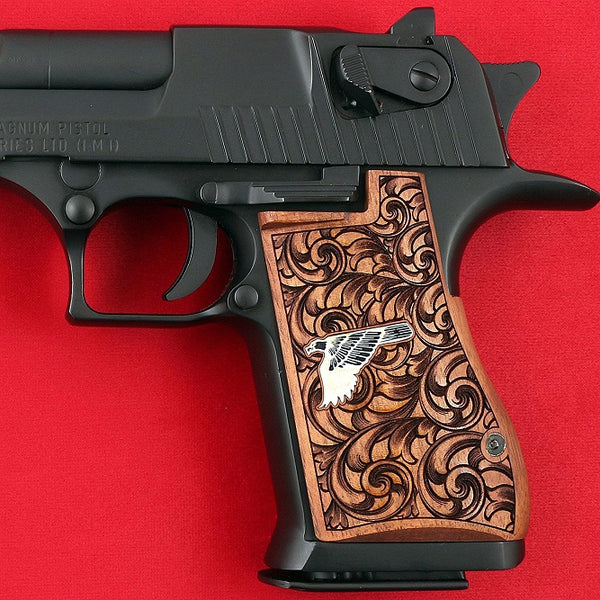 Desert Eagle Custom Pistol Grips made of Walnut wood with Custom logo made of Silver,crafted to deliver striking aesthetics and lasting performance. These grips are precision-milled for a perfect fit and hand-polished to a smooth finish.