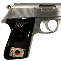 Walther PP grips (does not fit Arkansas). Made of Black Acrylic with custom logo made of silver.