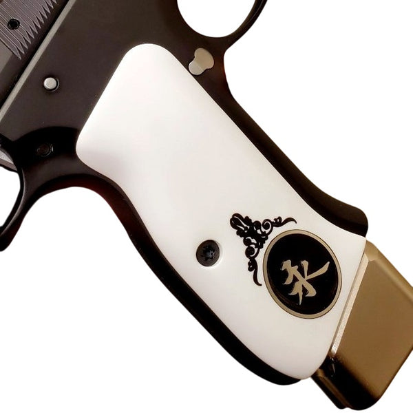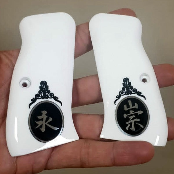 CZ 75 compact grips made of White Acrylic with custom Logo made of silver.