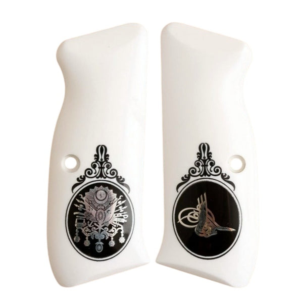 CZ 75 Full Size grips made of White Acrylic with custom logo made of silver.